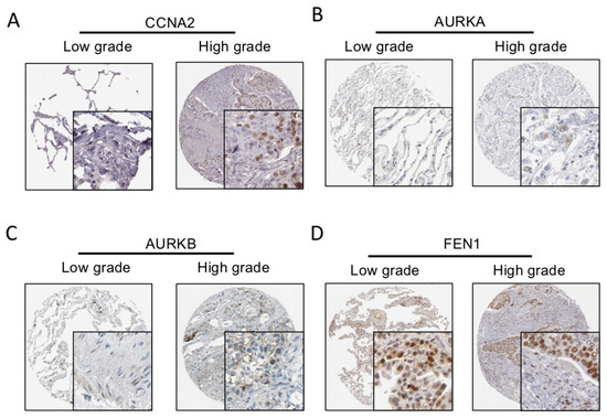 Key genes identified in the PPI network were mostly contained in the blue module in WGCNA analysis, including CCNA2, AURKA, AURKB, and FEN1 (Scores of these hub genes in PPI and WGCNA analysis were shown in Supplementary Table S4). GO analysis indicated that the blue module was associated with cell cycle, also consistent with PPI submodule analysis. This suggest that these four genes may play a pivotal role in LUSC development. Therefore, we defined these four genes CCNA2, AURKA, AURKB, and FEN1 as the hub genes related to LUSC. To further validation, as shown in Figure 4 (information about these samples were shown in Supplementary Table S5), immunohistochemistry (IHC) results indicated that they all have a significant up–regulated expression in LUSC (The distribution of IHC results of LUSC in whole database was shown in Supplementary Figure S5). We also analyzed whether somatic copy numbers alteration (SCNA) in LUSC are associated with high expression of these hub genes (SCNA data of LUSC were obtained in TCGA database). There is no significant correlation between hub gene’s expression and its SCNA (Supplementary Table S6).