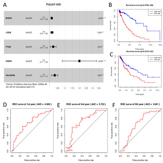 (A) Forest plot for multivariate cox regression. The Hazard Radio (HR) value is eβ. This figure displays the 95% confidence interval for the HR value over the box plot with associated p-values. An HR of greater than 1 indicates that high gene expression is bad for the prognosis. (B) Survival curve for patients with different risk scores in the training data. Patients were divided into two groups according to the median survival curve score. Blue represents patients with a lower risk score. p-value < 0.001. (C) Survival curve for patients in the test data. p-Value < 0.05. (D–F) ROC curves for the model representing 1-, 3-, and 5-year predictions in test data, respectively. The values in brackets are the areas under the curve.