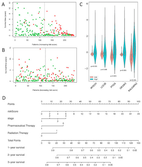 where Expi and β are the expression levels of gene i in a particular patient and coefficients of the gene i in the multivariate cox regression analysis [63]. The risk score for each patient was calculated, which were then categorized into high or low–risk in comparison with the median value. Kaplan–Meier survival curves were then plotted to evaluate whether the prediction effect of the model was significant (p < 0.05). The statistical method used in this process was a Log-rank test. The predictive performance of this model at different endpoints (1, 3, or 5 years) was assessed using a time-dependent receiver operating characteristic (ROC) curve [64]. The purpose of the above verification methods is to show that the risk score we get is reasonable. In addition, in order for our model to be more effectively applied to the clinical process, we took the clinical information (synchronous malignancy, gender, age, stage, chemotherapy, radiotherapy) into the prognostic model. Removing the samples with missing clinical data, we obtained a total of 370 samples. We performed a multivariate independent prognostic analysis of risk score and clinical information. The key factors with a p-value of < 0.1 were found through the forward–backward selection method, and a nomogram was drawn. The R packages used in the survival analysis procedure included: “survival”, “caret”, “glmnet”, “survminer", and “survivalROC”.