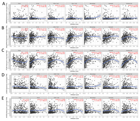 Correlation between different expressed prognostic genes and immune cell infiltration (TIMER). The correlation between the abundance of immune cell and the expression of (A) OR2W3, (B) RALGAPA2, (C) PTGIS, (D) LCE3E, (E) MYEOV in LUSC. “Purity” represents the purity of the tumor cells in the sample.