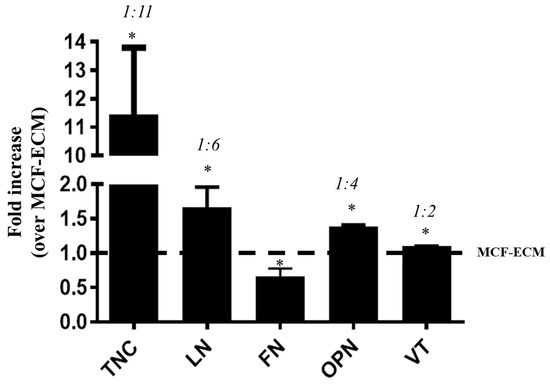 Differences among breast cancer cell-derived matrices. MCF-7 or MDA-MB-231 cells were grown in standard conditions for 72 h, and the respective derived extracellular matrices (ECMs) were obtained, as described in the Methods section. The contents of tenascin-C (TN-C), laminin (LN), fibronectin (FN), osteopontin (OPN), and vitronectin (VT) were assayed by indirect ELISA. The matrix protein content of MDA-ECM is shown as the fold increase relative to MCF-ECM. Numbers at the top of the plots represent an optical density ratio ranging from MCF-ECM:MDA-ECM. The plot is the mean of 3 independent experiments (* p < 0.05).