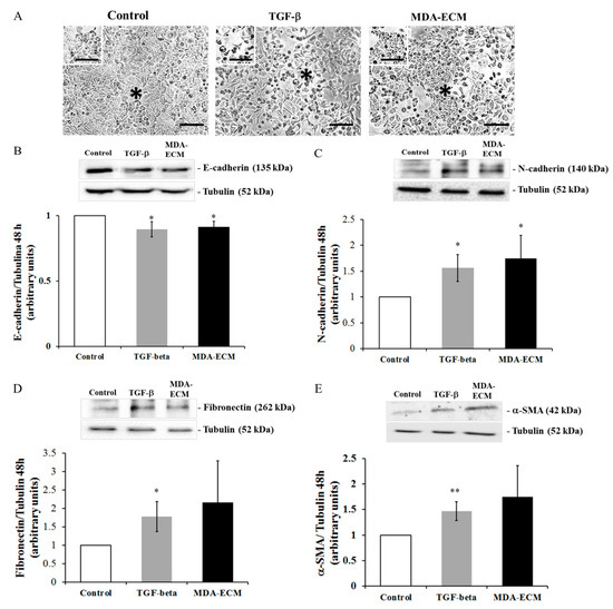 Specific ECM proteins have been reported to induce morphological changes in MCF-7 cells, triggering EMT [12,13,23,29,30,31]. The time of treatment has been reported to be critical for inducing EMT, varying with the stimulus. We observed that, after 48 h, while the MCF-7 cells treated with TGF-β1 changed their morphology, losing cell-cell contacts (*), the cells cultured on their own matrix (MCF-7-ECM), used as controls, were arranged as large clusters, with tight intercellular connections (*). The MCF-7 cells cultured onto MDA-ECM also presented an arrangement in large clusters more similar to controls but different from TGF-β-treated cells since they seemed to maintain looser intercellular connections (*) (Figure 2A). Besides, Figure 2B–E show that MCF-7 cells seeded on MDA-ECM for 48 h presented a slight decrease in E-cadherin and an increase in N-cadherin expression when compared to control (Figure 2B). No differences in the expression of fibronectin or α-SMA were observed.
