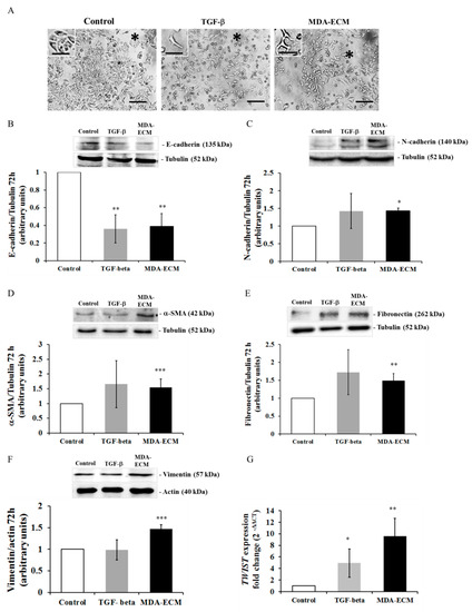 MDA-MB-231-derived ECM triggered morphological and phenotypical changes related to epithelial-mesenchymal transition (EMT) in MCF-7 cells after 72 h. MCF-7 and MDA-MB-231 cells were cultured in standard conditions for 72 h, and decellularized ECMs were obtained, as described in Methods. MCF-7 cells were cultured onto MDA-ECM or onto their own matrix with TGF-β1 (10 ng/mL) for 72 h. (A) Cell morphology was analyzed, and representative images were obtained at 40× magnification. A black asterisk indicates lost or remaining intercellular connections. Scale bar: 20 µm (B–F) Lysates of MCF-7 cultured as described for 72 h were immunoblotted with anti-E-cadherin (B), anti-N-cadherin (C), anti-α-SMA (D), anti-fibronectin (E), and anti-vimentin (F) antibodies. The results are shown as the mean fold increase relative to the control (MCF-ECM), and bars show the mean ± SD calculated from 3 individual experiments (* p < 0.05, ** p < 0.01 and *** p < 0.001). (G) MCF-7 cells were cultured for 48 h on MCF-ECM with or without TGF-β1 or MDA-ECM, and the expression of TWIST mRNA was analyzed. β-Actin was used as a housekeeping gene. The results are shown as the mean ± SD calculated from 3 individual experiments (* p < 0.05).