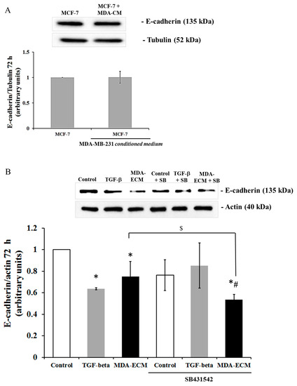 MDA-MB-231-derived ECM decreased E-cadherin expression in MCF-7 cells independent of TGF-beta receptor activation. MCF-7 and MDA-MB-231 cells were cultured in standard conditions for 72 h, and decellularized ECMs were obtained, as described in the Methods. (A) MCF-7 were seeded on their own matrix for 72 h with or without conditioned medium from MDA-MB-231 cultures. Cell lysates were immunoblotted with anti-E-cadherin and anti-tubulin antibodies. (B) MCF-7 cells were seeded on decellularized MCF-ECM with or without TGF-β1 or MDA-ECM in the presence or absence of the TGF-β receptor inhibitor SB431542 (15 µg/mL) for 72 h. Cell lysates were immunoblotted with anti-E-cadherin and anti-actin antibodies. The results are shown as the mean fold increase relative to the MCF-ECM (* p < 0.05); MCF-ECM treated with SB431542 (# p < 0.05) and MDA-ECM without inhibitor ($ p < 0.05) were calculated from 3 individual experiments.