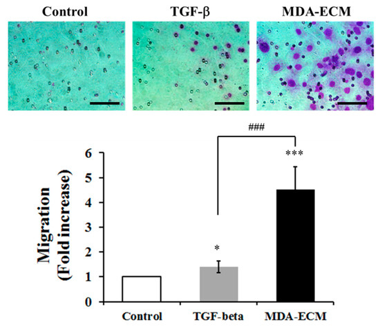 Effect of MDA-ECM on the migratory capacity of MCF-7 cells. MCF-7 and MDA-MB-231 cells were cultured in standard conditions for 72 h, and decellularized ECMs were obtained, as described in the Methods. MCF-7 cells were cultured for 72 h on decellularized ECM derived from MDA-MB-231 or MCF-7 cells with or without TGF-β1. After that, cells were trypsinized, seeded on Transwell chambers, and allowed to migrate toward FBS-enriched medium (10%) for 72 h. The number of migrated cells was counted, and the results are shown as the fold increase relative to the control MCF-ECM (* p < 0.05 and *** p < 0.001) and the positive control TGF-beta (### p < 0.001) and presented as the mean ± SD calculated from 3 individual experiments. Scale bar: 20 µm.