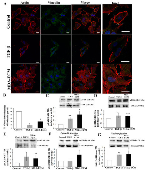 Interaction with MDA-ECM triggered integrin and TGF-β-associated signaling pathways in MCF-7 cells. (A) MCF-7 and MDA-MB-231 cells were cultured in standard conditions on coverslips for 72 h, and decellularized ECMs were obtained, as described in Methods. For double staining of F-actin and vinculin (indicated by the white asterisks), cells were marked with rhodamine-conjugated phalloidin (red) and anti-vinculin antibody (green), and nuclei were stained with DAPI. Representative images were captured at 60× magnification. Focal adhesion assembly in control is highly visible in the section at high magnification (insets-right column). Scale bar: 20 µm. (B) Representative graph showing the percentage of colocalization of vinculin and actin in comparison to the control MCF-ECM. Cell lysates were immunoblotted with (C) anti-pFAKTyr397 and anti-FAK, (D) anti-pERK1/2 and anti-ERK1/2, (E) anti-pAKTSer473 and anti-AKT, (F) anti-pSMAD2 and anti-SMAD2, and (G) anti-SMAD 4 and anti-histone (H3) antibodies. The results are shown as the fold increase compared to the MCF-ECM group, calculated from 3 individual experiments (* p < 0.05; ** p < 0.01; *** p < 0.001).