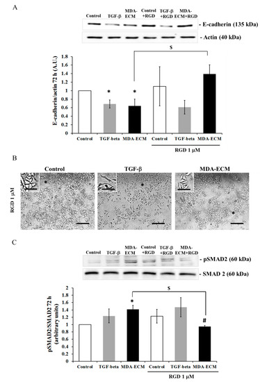 Integrins are reported to have a critical role during the process of EMT through crosstalk with TGF-β receptors [4,8,12,19,39]. To evaluate the role of integrins in the activation of TGF-βR signaling activation, the experiments were performed in the presence of a synthetic tripeptide RGD (Arg-Gly-Asp) that blocks αv integrin activation [40]. Figure 7 shows that the RGD peptide impaired the decrease in E-cadherin levels (Figure 7A) of cells cultured onto MDA-ECM. Supporting the data, the immunofluorescence analysis showed the presence of E-cadherin in the intercellular junctions in MCF-7 cells cultured on MDA-ECM treated with RGD, contrasting with cells not treated with the peptide or stimulated with TGF-β1 (Figure S2A,B). In addition, RGD treatment inhibited SMAD2 phosphorylation only in MCF-7 cells cultured on MDA-ECM and not in MCF-ECM groups (Figure 7C).