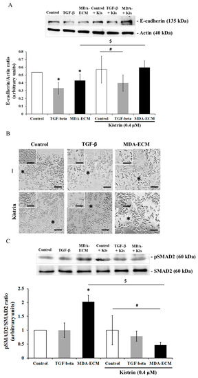 Involvement of integrin αvβ3 in EMT of MCF-7 cells cultured on MDA-ECM. MCF-ECM and MDA-ECM were obtained, as described in the Methods section. MCF-7 cells were cultured on their own ECM with or without TGF-β1 or on MDA-ECM and treated with Kistrin for 72 h (0.4 µM). Cell lysates were immunoblotted with (A) anti-E-cadherin and (C) anti-p-SMAD2 antibodies. The results are shown as the mean fold increase relative to controls: MCF-ECM (* p < 0.05), MCF-ECM + Kistrin (# p < 0.05),and MDA-ECM ($ p < 0.05), calculated from 3 individual experiments. (B) Representative images of MCF-7 cell cultures of each experimental group, treated or not with Kistrin (0.4 µM), at 10× magnification. A black asterisk indicates lost or remaining intercellular connections. Scale bar: 20 µm.