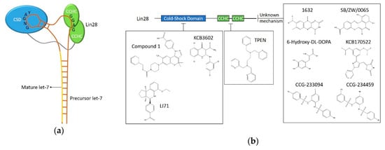 Let-7 was first discovered as a regulator of stem cell differentiation in C. elegans. There are nine mature let-7 miRNAs in the human let-7 family, encoded by 12 different genomic loci []. The biogenesis of let-7 is blocked by Lin28 proteins through the interactions with the let-7 terminal loop [,,,]. Let-7a-3 is an exception that evades Lin28A regulation []. Lin28 is abundantly expressed in undifferentiated cells and its expression declines during differentiation, which is reciprocal to the mature let-7 level []. Lin28A and Lin28B are the two paralogs in human cells, sharing a conserved cold-shock domain (CSD) and two tandem Cys-Cys-His-Cys (CCHC) zinc finger domains. The CSD domain and CCHC motifs bind the terminal loop of let-7 precursors at the GNGAY and GGAG motifs, respectively [] (Figure 1a). Lin28A recruits TUT4 (terminal uridylyltransferase 4) together with E3 ligase Trim25 to induce a 3’-uridylation of pre-let-7; therefore, preventing Dicer processing [,]. Alternatively, Lin28B retains pri-let-7 in the nucleoli, where the microprocessor is not available [].
