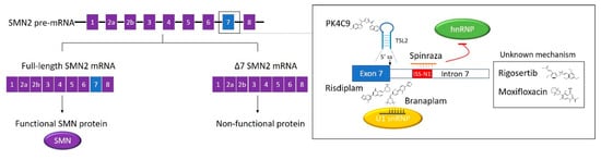 Luciferase SMN2 minigene reporters were extensively applied in the previous HTS of SMN2 splicing modulators [,]. Rigosertib, a well-known PLK (Polo-like kinase) inhibitor, was identified as the best candidate from a drug screening using the SMN2 reporter cell lines []. Rigosertib induced exon 7 inclusion and SMN protein restoration in motor neuron progenitors differentiated from SMA patient-derived induced pluripotent stem cells (SMA iPSCs-pMN). SMA-related pathological phenotypes were rescued by the candidate compound in this human SMA model cell line []. Another very recent HTS described moxifloxacin as an exon 7 inclusion enhancer using a SMN2 minigene reporter in Drosophila motor neurons. The effects were validated in patient-derived fibroblasts [].