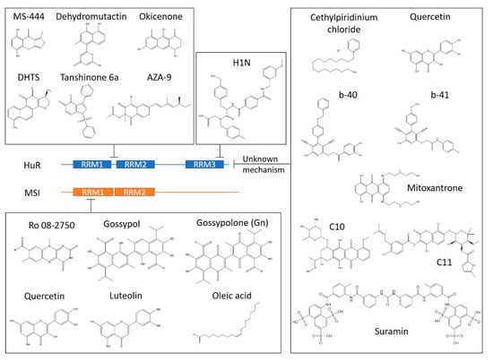 Regulation of HuR and Musashi proteins (MSI) binding to RNA. RNA recognition motifs (RRMs) of HuR are shown in blue, and RRMs of MSI are shown in orange. Small molecules interrupting RNA binding activities of HuR or MSI are displayed. The known targeting RRMs are indicated. HuR inhibitors with unknown mechanisms are shown.