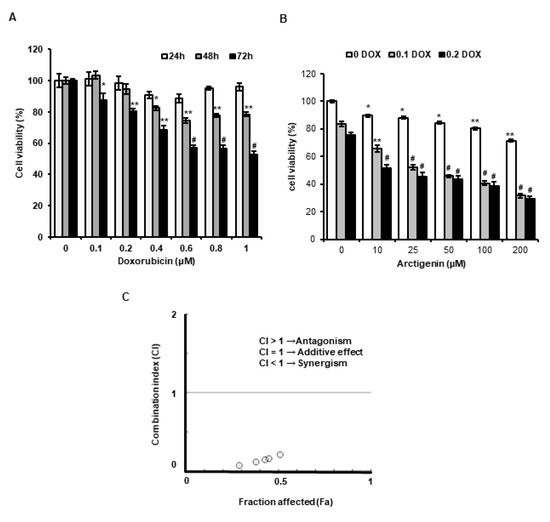 Effect of arctigenin (ATG) co-treatment on doxorubicin (DOX)-induced cytotoxicity in MDA-MB-231 cells. (A) Cells were incubated in Dulbecco’s Modified Eagle’s medium (DMEM) medium containing various concentrations of DOX (0–1 µM) for 24, 48, or 72 h. *, ** and # indicate p < 0.05, p < 0.01 and p < 0.001 vs. non-treated controls. (B) Cells were incubated in DMEM medium containing various concentration of ATG (0–200 μM) with or without 0.2 μM DOX for 72 h. ATG enhanced cytotoxicity of DOX in a concentration-dependent manner. * and ** indicate p < 0.05 and p < 0.01 vs. non-treated controls. ## and ### indicate p < 0.0005 and p < 0.0001 vs. non-treated controls. (A,B) Cell viabilities were determined using an MTT assay. All experiments were performed independently three times and results are presented as means ± SDs. (C) Combination indices (CI) versus fractional affected (Fa) plots for ATG/DOX co-treatment were graphically represented by Compusyn software. Synergistic cytotoxic activity of ATG/DOX co-treatment was observed in MDA-MB-231 human triple negative breast cancer cells. A CI value of < 1 indicates a synergistic cytotoxic effect.