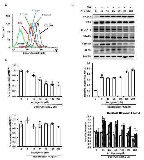 Effects of ATG on DOX uptake, the transcriptions of multidrug resistance-associated protein 1 (MRP1) and breast cancer resistance protein 1 (BCRP1), the phosphorylations of H2A histone family member X (H2A.X) and signal transducer and activator of transcription 3 (STAT3), and the expressions of survivin and DNA repair protein RAD51 homolog 1 isoform 1 (RAD51) in MDA-MB-231 cells. (A) Cells were grown for 48 h with various concentrations of ATG (0–200 μM) prior to being treated with 0.2 μM DOX treatment for 24 h. DOX uptake was analyzed by flow cytometry. ATG accelerated DOX uptake in a concentration-dependent manner. The X-axis shows fluorescence intensities of intracellular DOX and the Y-axis cell numbers per channel. (B) Cells were attached for 24 h and further grown for 24 h in DMEM medium supplemented 2% fetal bovine serum (FBS), 0.2 μM DOX, and various concentration of ATG (0–200 μM). MRP1 gene expression was suppressed by ATG/DOX co-treatment. Relative expressions of MRP1 and BCRP1 genes were evaluated in triplicate and normalized versus glyceraldehyde-3-phosphate dehydrogenase (GAPDH). *, ** and # indicate p < 0.05, p < 0.01, and p < 0.001 vs. DOX treated cells. –: 0.2 μM DOX-untreated, +: 0.2 μM DOX-treated (C) Cells were attached for 24 h and then co-treatment with 0.2 μM DOX and various concentration of ATG (0–200 μM) for 72 h in DMEM medium supplemented with 2% FBS. The proteins in whole cell lysates were separated by 8% or 15% sodium dodecyl sulfate (SDS)-polyacrylamide gel electrophoresis (PAGE) and transferred to polyvinylidenefluoride (PVDF) membranes. Bands were densitometrically analyzed using Scion Image and band densities were normalized versus β-actin. $ and $$ indicate p < 0.01 and p < 0.005 vs. non-treated control. *, ** and *** indicate p < 0.05, p < 0.01 and p < 0.005 vs. DOX treated cells. (B, C) All experiments were conducted independently three times and results are presented as means ± SDs.