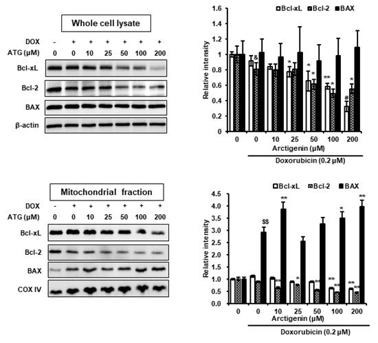 Effects of ATG/DOX co-treatment on mitochondrial Bcl-xL, B-cell lymphoma 2 (Bcl-2), and BAX levels in MDA-MB-231 cells. Cells were attached for 24 h and then co-treated with 0.2 μM DOX and various concentrations of ATG (0–200 μM) for 72 h in DMEM supplemented with 2% FBS. ATG/DOX co-treatment reduced Bcl-xL and Bcl-2 levels in whole cell lysate and mitochondria. In contrast, mitochondrial BAX was increased by ATG/DOX co-treatment. The proteins in whole cell lysates and mitochondrial fractions were separated by 15% SDS-PAGE and transferred to PVDF membranes. β-Actin and mitochondrial cytochrome c oxidase subunit IV (COX IV) were used as internal controls in whole cell lysates and mitochondrial fractions, respectively. All bands were densitometrically analyzed using Scion Image and band densities in samples were normalized versus β-actin and COX IV, respectively. & and $$ indicate p < 0.05 and p < 0.005 vs. non-treated controls. *, ** and # indicate p < 0.05, p < 0.01, and p < 0.001 vs. DOX treated cells. Experiments were conducted independently three times and results are presented as means ± SDs. –: 0.2 μM DOX-untreated, +: 0.2 μM DOX-treated.