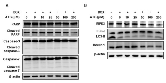 Effects of ATG/DOX co-treatment on the activations of caspase-3 and -7 and on the expressions of necroptosis and autophagy factors in MDA-MB-231 cells. (A,B) Cells were attached for 24 h and then co-treated with 0.2 μM DOX and various concentration of ATG (0–200 μM) for 72 h in DMEM medium supplemented with 2% FBS. –: 0.2 μM DOX-untreated, +: 0.2 μM DOX-treated (A) ATG/DOX co-treatment did not affect the cleavages of poly (ADP-ribose) polymerase (PARP), caspase-3, or caspase-7. Proteins in whole cell lysates were separated by 10% or 15% SDS-PAGE and transferred to PVDF membranes. All experiments were conducted independently three times. (B) ATG/DOX co-treatment did not affect the expression of receptor interacting serine/threonine kinase 3 (RIPK3), LC3-II or Beclin. Proteins in whole cell lysates were separated by 8% or 15% SDS-PAGE and transferred to PVDF membranes. All experiments were conducted independently three times.
