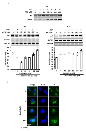 Survivin prevents caspase-independent apoptosis inducing factor (AIF)-dependent cell death [26]. Accordingly, we evaluated the effect of ATG/DOX co-treatment on the nuclear translocation of AIF to determine whether inhibition of survivin expression by ATG/DOX co-treatment was associated with AIF-dependent cell death. The results showed that nuclear AIF levels were increased by ATG/DOX co-treatment as determined by Western blotting and immunocytochemistry (Figure 5A,B), which indicated ATG/DOX co-treatment-induced cell death was mediated by AIF.