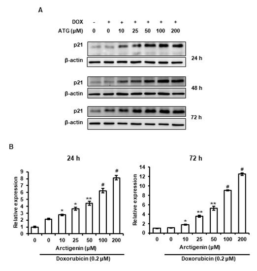 p21 is a cyclin-dependent kinase that induces cell cycle arrest [27] and has been reported to be involved in cell death [28,29]. Therefore, we evaluated the effect of ATG/DOX co-treatment on p21 expression. The mRNA and protein levels of p21 were enhanced by ATG/DOX co-treatment in a dose-dependent manner (Figure 6A,B). Furthermore, the up-regulation of its mRNA and protein levels were sustained at 24–72 h after ATG/DOX co-treatment, which suggested ATG/DOX co-treatment-induced cell death involved the up-regulation of p21.
