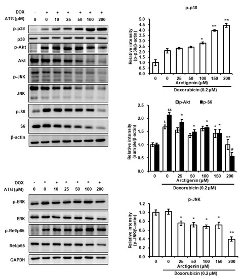 C-Jun N-terminal kinase (JNK), extracellular signal-regulated kinase (ERK), and p38, and Akt play important roles in cell survival and death [30,31]. Hence, we evaluated whether ATG/DOX co-treatment altered the phosphorylations of MAPKs and Akt. We found p38 MAPK phosphorylation was increased by co-treatment and that this co-occurred with the nuclear translocation of AIF and reductions in the phosphorylations of Akt and JNK (Figure 7). Furthermore, ribosomal protein S6 phosphorylation induced by DOX was prevented by ATG/DOX (Figure 7), whereas DOX-induced phosphorylations of ERK and Rel/p65 were unaffected (Figure 7). These results suggest increased cell death by ATG/DOX co-treatment was mediated by the activation of p38 and by suppressions of the JNK and Akt signaling pathways.
