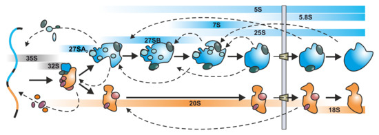 - Baßler, J.; Hurt, E. Eukaryotic Ribosome Assembly. Annu. Rev. Biochem. 2019, 88, 281–306. [Google Scholar] [CrossRef] [PubMed]