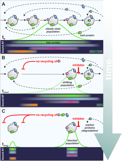 Due to the rapid transition of pre-ribosomal particles through the maturation cascade, assembly factors show highly dynamic association and dissociation, with the mean residence time depending on the exact stage of association and dissociation but clearly in the seconds to minutes range. The accumulation of distinct proteins on purified precursor particles indicates that these proteins are part of the accumulated particle population (Figure 3, magenta factor). In contrast, decrease on ribosomal intermediates can either signal that the factor assembles prior to the bait protein and leaves the particle upstream of the block (Figure 3, orange factor) or that the respective protein joins the maturation downstream of the inhibited stage (Figure 3, dark green factor). In both cases there is a decreased population that contains the respective assembly factor. Assembly factors that bind prior to the bait protein and disassemble after the bait protein are unchanged (Figure 3, blue factor). The extent to which the level of a factor changes in a shifting population indicates the distance of the assembly or disassembly event relative to the inhibitor-mediated block. Factors that bind shortly prior to the block will show a stronger relative accumulation than factors that where already assembled further upstream. On the contrary, factors that should leave the particle shortly after the block would decrease to a greater extent than ones that disassemble later. Thus, determining the relative protein accumulation can unravel the hierarchical order of assembly factors. If such analyses are performed with overlapping bait proteins and/or in sharp time series, very detailed information about association and dissociation characteristics of many factors can be obtained. In addition, factors can be assigned to specific reactions in the pathway, based on similar binding or dissociation kinetics [63].