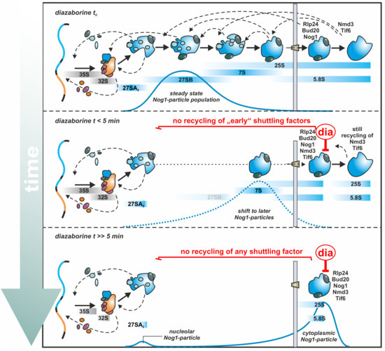 This kinetic analysis of the transition of Nog1 through the maturation cascade provides a detailed picture of the order of assembly and disassembly events and allowed setting it into the context of pre-rRNA processing. The extent at which the maturation factors accumulate or decrease indicate their hierarchical order of joining and release. Intriguingly, assembly factors participating in the same maturation step show similar kinetics [63]. This observation also allows assignment of maturation factors with unknown functions to specific reactions. Only after 15 minutes of incubation with the drug de novo synthesized Nog1 was observed, which associated with 27SA2 pre-rRNA (Figure 4, diazaborine t >> 5 min) [63]. This finding suggests that the prevalent assembly activity is driven by recycled and not freshly synthesized maturation factors.
