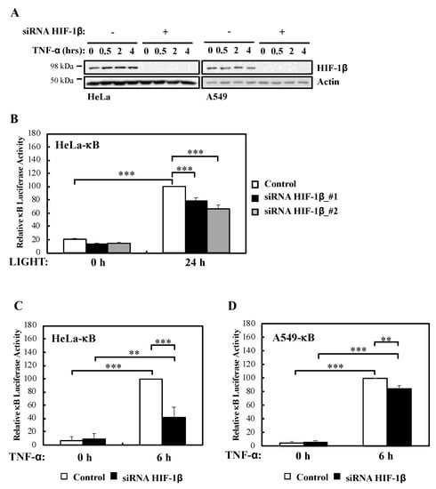 HIF-1β is required for full NF-κB reporter gene activity following non-canonical and canonical stimuli. (A) HeLa and A549 cells were transfected with control or HIF-1β siRNA oligonucleotides prior to treatment with 10 ng/mL TNF-α for the indicated periods of time before lysis and Western blot analysis. Actin was used as a loading control. (B) HeLa-κB luciferase cells were transfected with control and HIF-1β siRNAs for 24 h prior to treatment with 100 ng/mL LIGHT for another 24 h prior to lysis and luciferase activity measurements. All values were normalised to untreated sample. Graph depicts mean and SEM from four independent biological experiments. One way ANOVA analysis was performed and levels of significance was determined as follows: *** p < 0.001. (C) HeLa-κB luciferase cells were transfected as in A, but 10 ng/mL TNF-α was added for 6 h prior to lysis and luciferase measurements. Graph depicts mean and SEM from four independent biological experiments. One way ANOVA analysis was performed and levels of significance are indicated as follows: ** p < 0.01, *** p < 0.001. (D) A549- κB luciferase cells were treated as in 1C. Graph depicts mean and SEM from three independent biological experiments. One way ANOVA analysis was performed and levels of significance determined as follows: ** p < 0.01, *** p < 0.001.