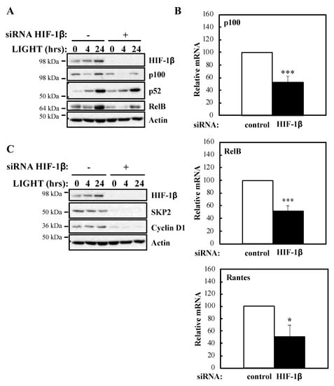 To determine whether our luciferase reporter results were also reflected at the level of endogenous targets, we investigated NF-κB subunits expression and some of their target genes in the presence or absence of HIF-1β following treatment with LIGHT (Figure 2) or TNF-α (Figure 3). Levels of RelB and p100 were significantly reduced in the absence of HIF-1β in response to both stimuli (Figure 2A; Figure 3A). This reduction in p100 was also observed in another cellular background, A549 lung cancer cells (Figure S2A). In response to LIGHT, we could observe significant reduction in the mRNA levels of p100 and RelB, as well as in Rantes, a target of the non-canonical NF-κB pathway (Figure 2B), when HIF-1β was depleted. Furthermore, other p52-dependent target genes [,] were also reduced at protein level in the absence of HIF-1β (Figure 2C).