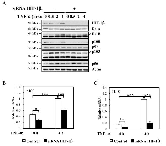 In response to TNF-α, p105 levels were also reduced (Figure 3A) in the absence of HIF-1β, a predicted result since these NF-κB subunits are under the direct control of RelA []. Also, as expected, and given that it is not an NF-κB target, RelA levels were unaffected by HIF-1β depletion in response to TNF-α (Figure 3A). Importantly, NF-κB targets such as p100 and IL-8 mRNA levels were also reduced in the absence of HIF-1β following TNF-α treatment (Figure 3B,C). Furthermore, when we overexpressed HIF-1β, levels of p100 and IL-8 mRNA were also significant increased following TNF-α treatment (Figure S2C,D), suggesting that indeed HIF-1β levels have an impact on NF-κB signaling in the cells we investigated.