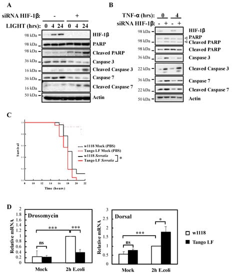 It is well known that NF-κB signalling in response to TNF-α is used to prevent cell death []. To understand the biological impact of HIF-1β, we investigated cellular apoptosis markers as well as organism survival using the model system Drosophila melanogaster (Figure 4). Our analysis revealed that HIF-1β depletion led to increased levels of apoptotic markers in control, LIGHT and TNF-α treated cells (Figure 4A,B). Increased levels of cleaved Poly-ADP Ribose Polymerase (PARP), cleaved caspase-3 and cleaved caspase-7 were observed when HIF-1β levels were reduced by siRNA (Figure 4A,B). In Drosophila, NF-κB mediates innate immunity responses to infection []. We had previously demonstrated that loss of NF-κB in Drosophila results in reduced viability in response to infection with bacterial strains such as Serratia marcescens []. Importantly, at the level of the whole organism, loss of function of Drosophila HIF-1β, Tango (Figure S3A,B), resulted in reduced viability in response to infection with Serratia marcescens (Figure 4C).