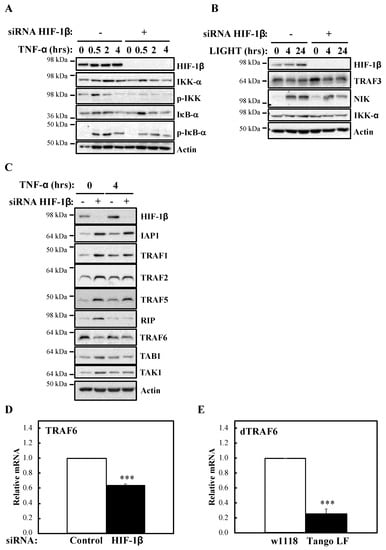 HIF-1β is required to control TRAF6 levels. (A) HeLa cells were transfected with control or HIF-1β siRNA oligonucleotides. Where indicated, cells where treated with 10 ng/mL TNF-α for the periods of time depicted prior to whole cell lysis and Western blot analysis. Actin was used as a loading control. (B) HeLa cells were transfected as in 5A, but where indicated, cells were treated with 100 ng/mL LIGHT prior to whole cell lysis and Western blot analysis. Actin was used as a loading control. (C) HeLa cells were transfected as in 5A, but treated with 10 ng/mL TNF-α for 4 h prior to cell lysis and Western blot analysis. Actin was used as a loading control. (D) HeLa cells were transfected with control or HIF-1β siRNA oligonucleotides for 48 h prior to lysis and RNA extraction. Following cDNA synthesis, qPCR was performed using specific primers for TRAF6. Graphs depict mean and SEM from three independent biological experiments. Student t-test analysis was performed and levels of significance determined as follows: *** p < 0.001. (E) Wild-type adult flies (w1118) and HIF-1β loss-of-function flies (Tango LF) were used for RNA extraction and cDNA synthesis. qPCR analysis was performed for the levels of dTRAF6. Graph depicts mean and SEM from three independent biological experiments. Student t-test analysis was performed and levels of significance as follows: *** p < 0.001.