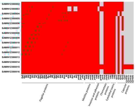 - Koolman, L.; Whyte, P.; Burgess, C.; Bolton, D. Distribution of virulence-associated genes in a selection of Campylobacter isolates. Foodborne Pathog Dis. 2015, 12, 424–432. [Google Scholar] [CrossRef] [PubMed]