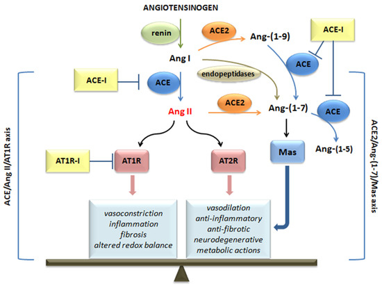 The effects exerted by these two membrane receptors are opposite, in particular, AT1R induces detrimental effects, such as inflammation, fibrosis, and altered redox balance in addition to vasoconstrictive properties, whereas AT2R is involved in protective and regenerating actions (anti-inflammatory, anti-fibrotic, neurodegenerative, metabolic) and in the release of vasodilatory molecules [7,8,9]. Therefore, the equilibrium point of the RAS is represented by Ang II, which can also be converted into heptapeptide Ang-(1-7) thanks to the action of angiotensin-converting enzyme 2 (ACE2). Ang-(1-7), which can also be generated by the cleavage of ANG I by endopeptidases, and binds Mas receptors counteracting most of the deleterious actions of the ACE/Ang II/AT1 axis, especially in pathological conditions [10,11].