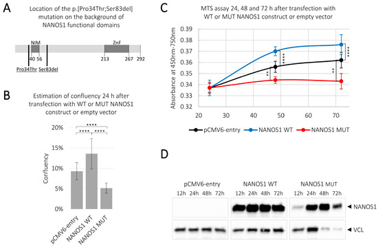Influence of the wild-type and the mutated NANOS1 p.[(Pro34Thr);(Ser83del)] on cell confluency and proliferation. TCam-2 cells were transfected with plasmids encoding the wild-type (WT) NANOS1, the mutated (MUT) NANOS1 or the empty pCMV6-entry vector. (A) Scheme of the NANOS1 protein. NOT1 interacting motif (NIM) domain, zinc-finger (ZnF) domain, and amino acid position of the double mutation p.[(Pro34Thr);(Ser83del)] are indicated. (B) Confluency measurement 24 h after transfection using JuLI™ FL Fluorescence Cell History Recorder. (C) The MTS assay was used to analyze cell proliferation of TCam-2 cells 24, 48, and 72 h after transfection. A similar number of cells counted 12 h after transfection was used for normalization of each experiment. This experiment was performed in three biological replicates. (D) The expression of the wild-type and the mutated NANOS1 constructs after transfection compared to the negative control was analyzed by western blot analysis using an anti-DDK antibody. As a loading control, VCL (vinculin) protein was used, in each sample shown in the lower panel. A p value < 0.05 was considered statistically significant, a p value < 0.005 was marked by two asterisks (**), and a p value < 0.00005 by four asterisks (****).