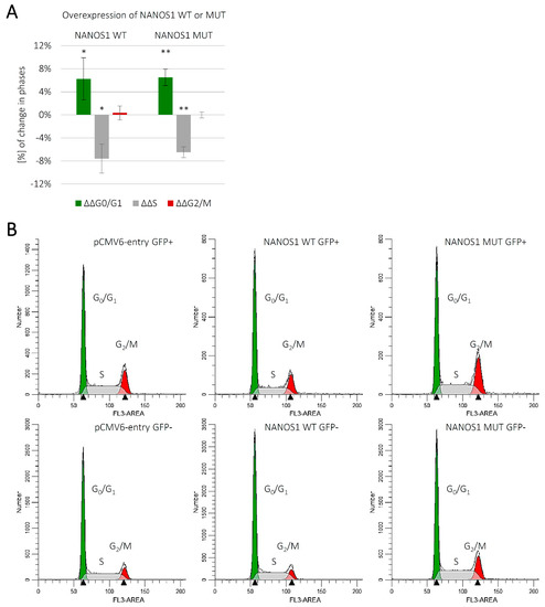 Cell cycle analysis of propidium iodide-stained TCam-2 cells by flow cytometry. (A) The graph represents distribution at G0/G1, S, and G2/M cell cycle phases of unsynchronized TCam-2 cells overexpressing the wild-type (WT) NANOS1 or the mutated (MUT) NANOS1 p.[(Pro34Thr);(Ser83del)] compared to the empty pCMV6-entry control vector (baseline). Flow cytometry measurement of the distribution was performed 48 h after transfection with the construct encoding the wild-type, the mutated NANOS1 or the empty pCMV6-entry vector co-transfected with GFP-F. Percentages of cells in each cell cycle phase were calculated using ModFit LT 5.0 software. This experiment was repeated in four independent replicates. A p value < 0.05 was considered statistically significant and was marked by one asterisk (*), and a p value < 0.005 was marked by two asterisks (**). (B) Histogram representation of the TCam-2 cell distribution at G0/G1, S, and G2/M phases of the cell cycle in unsynchronized culture upon transfection with the construct encoding the wild-type (WT) or the mutated (MUT) NANOS1 or the empty pCMV6-entry vector co-transfected with GFP-F. Histograms were generated by ModFit LT 5.0 software and show one representative example from four independent experiments.