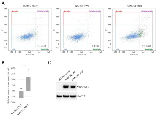 Influence of the wild-type and the mutated NANOS1 p.[(Pro34Thr);(Ser83del)] on apoptosis of TCam-2 cells. The apoptosis was measured by using Annexin V staining and flow cytometry. (A) The representation of dot plots generated by flow cytometric analysis of the apoptosis in TCam-2 cells upon transfection of the wild-type (WT), the mutated (MUT) NANOS1 or the empty pCMV6-entry plasmid. The percentages of apoptotic cells are shown in each plot. (B) The dot plots data quantitation that represents the proportion of apoptotic cells in TCam-2 cells transfected with the wild-type or the mutated NANOS1, relative to cells transfected with the empty vector (baseline). (C) Western blot analysis after transfection of TCam-2 cells with the pCMV6-entry vector, the wild-type or the mutated NANOS1. As a loading control, we used ACTB (actin beta) protein, in each sample shown in the lower panel. These experiments were performed in three biological replicates. A p value < 0.05 was considered statistically significant and was marked by one asterisk (*), and a p value < 0.005 was marked by two asterisks (**).