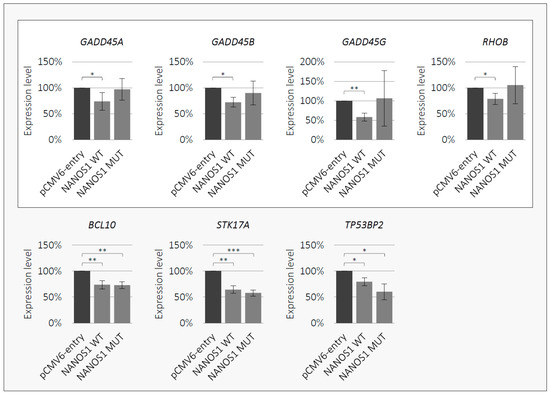 Given that the NANOS1 protein is a posttranscriptional regulator of gene expression [18], we performed a search for apoptosis-related transcripts regulated by NANOS1 in order to elucidate its anti-apoptotic property. Therefore, we carried out RNA-Seq analysis of the wild-type NANOS1 overexpression in TCam-2 cells (RNA-Seq data are available from the Gene Expression Omnibus, accession GSE134802). In this way, we identified 10 mRNAs encoding pro-apoptotic factors (GADD45A, GADD45B, GADD45G, RHOB, BCL10, STK17A, TP53BP2, RIPK1, SIAH1, JUN), which were downregulated upon NANOS1 overexpression (Table 1). We confirmed downregulation of seven of them (GADD45A, GADD45B, GADD45G, RHOB, BCL10, STK17A, TP53BP2) using RT-qPCR (Figure 4). Thus, for the first time, we identified genes encoding pro-apoptotic factors to be downregulated by NANOS1. To the best of our knowledge, this is also the first identification of any apoptosis-related mRNAs regulated by any Nanos protein among vertebrates. Finally, we investigated whether the p.[(Pro34Thr);(Ser83del)] mutation affects NANOS1-mediated regulation by performing RT-qPCR upon overexpression of the mutated NANOS1. We found that the regulation of four mRNAs (GADD45A, GADD45B, GADD45G, RHOB) was abrogated by the p.[(Pro34Thr);(Ser83del)] NANOS1 mutation (Figure 4, upper panel). Interestingly, all of these mRNAs encode proteins of closely related functions, namely, factors activating DNA damage-induced apoptosis.