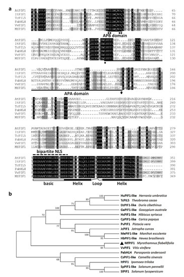 Sequence alignment and phylogenetic analysis of MfPIF1. (a) Multiple sequence alignment of MfPIF1 and some highly humongous phytochrome-interacting factors (PIFs). Identical and similar amino acids are shaded in black and gray, respectively. The putative NLS is marked by a dashed line. Active phytochrome B-binding (APB) and active phytochrome A-binding (APA) domains are marked as bold lines, conserved amino acid residues are marked by dots, and the altered amino acid residue at position 169 is indicated by an arrow. The basic region is indicated by a white box, and helix-loop-helix (HLH) conserved domain is labeled with black boxes linked by a curve. (b) Phylogenetic tree constructed using neighbor-joining method. MfPIF1 is indicated by a triangle. The GenBank accession numbers are listed in Supplementary Table S1.
