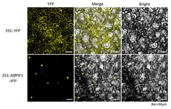 Subcellular localization of MfPIF1 in tobacco epidermis. Fluorescence detection of MfPIF1-YFP fusion protein in tobacco leaf epidermal cells, and tobacco epidermis transformed with 35S::YFP was used as a control (upper lane).