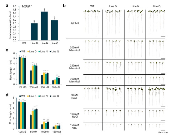 To explore the potential function of MfPIF1 in responding to abiotic stress, heterogeneous expression of the MfPIF1 gene in Arabidopsis was performed by constructing a binary vector pGSA1403-MfPIF1. T1 transgenic Arabidopsis lines were acquired from kanamycin resistance screening, and the T3 transgenic lines, Line D, Line N, and Line Q, were propagated subsequently. The qRT-PCR results confirmed that expression level of MfPIF1 could not be detected in wild type (WT), but it was found in all three transgenic lines investigated, with the Line N exhibiting significantly higher expression than the other two lines (Figure 3a). This experiment showed that MfPIF1 was overexpressed in the measured transgenic Arabidopsis, and these three transgenic lines can be selected for subsequent experiments.