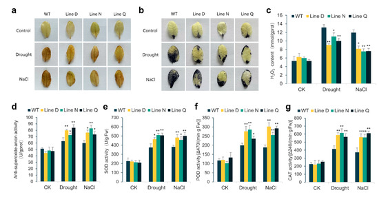 As is well known, the cellular oxidative damage aggravates with the level of lipid peroxide rising when plants suffered from abiotic stresses, which is evoked by a large excess of reactive oxidative species (ROS), for instance, hydrogen peroxide (H2O2) and superoxide anion radical (O2−), existing in plant cells. Therefore, we used the histochemical staining of DAB and NBT to detect cellular ROS levels under drought and salinity stresses. As shown in Figure 5, the larger leaf areas of WT plants were stained in deeper color than those of transgenic lines (Figure 5a,b), indicating that the transgenic lines underwent less cellular oxidative damage under both stresses. In accordance with these results, less H2O2 content was detected in three transgenic lines after the drought and salt treatments, which also showed higher anti-superoxide anion activity (Figure 5c,d).