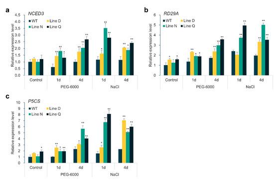 Expression levels of ABA-responsive genes. (a–c) indicated expression levels of NCED3, RD29A, and P5CS measured by qRT-PCR under normal condition, or treated by 10% PEG-6000 or 300 mM NaCl for 1 d and 4 d, respectively. AtActin2 was used as an internal reference. Data are presented as mean and SD values of three independent experiments. Asterisks indicates significant difference (* p < 0.05, ** p < 0.01, by Student’s t-test) comparing to WT.