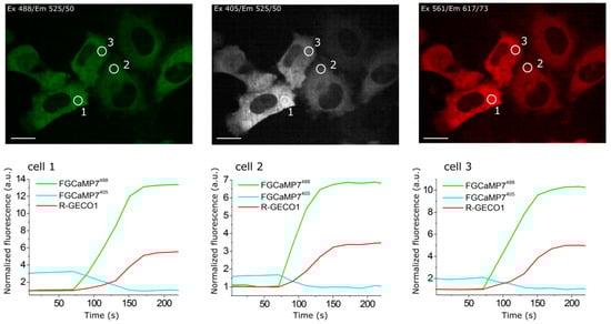 The response of the FGCaMP7 indicator to variations in cytoplasmic calcium concentration in HeLa Kyoto cells. (Upper panels) Confocal images of HeLa Kyoto cells co-expressing ratiometric indicator FGCaMP7 at 488 nm (left panel) and 405 nm (middle panel) excitations and red indicator R-GECO1 at 561 nm excitation (right panel). (Lower panels) The graphs illustrate changes in green fluorescence of FGCaMP7 at 488 nm (green lines) and 405 nm (cyan lines) excitations and red fluorescence of co-expressed R-GECO1 (red lines) GECI in response to 2.5 μM ionomycin. Changes in fluorescence are shown for three cells. The changes shown in graphs correspond to the areas indicated with white circles in the images in upper panels. Scale bar: 20 μm.