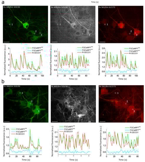 FGCaMP7 preserved the ratiometric phenotype of FGCaMP with a ratiometric contrast 3.0-fold higher than the contrast of FGCaMP. The main application of GECIs is in vivo photometry, and the advantage of the non-ratiometric GCaMP6 indicators in this regard is the ability to use 405 nm as the “isobestic” wavelength, where calcium does not affect fluorescence [62,63]. This is typically used to normalize signals and remove motion artifacts. In this type of application, the control 405 nm light should be avoided in the case of ratiometric FGCaMP7 and other control wavelengths such as 561 or 640 nm might be used.