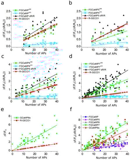 Fluorescence changes in cultured neurons co-expressing FGCaMP series and R-GECO1 in response to electric stimulation. (a–e) Fluorescence changes (ΔF/F0 and ΔR/R0) of FGCaMP, FGCaMP5, FGCaMP6, FGCaMP7, and GCaMP6s GECIs in response to external electric stimulation of neuronal cultures as a function of APs. APs were calculated by normalization of ΔF/F0 of co-expressed R-GECO1 to the 4% value, which is induced at 1 AP stimuli of R-GECO1, and assuming linear dependence of R-GECO1 response vs. APs [43]. (f) Ratiometric changes (ΔR/R0) for FGCaMP, FGCaMP5, FGCaMP6, FGCaMP7, and fluorescence change (ΔF/F0) for GCaMP6s GECIs.