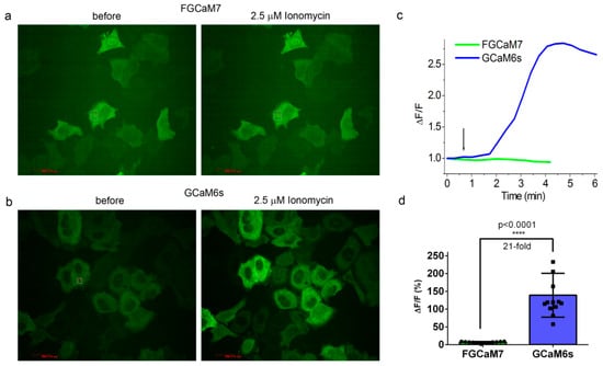 To assess the possible interactions of the FGCaMP7 and GCaMP6s proteins with the intracellular environment, we analyzed the responses of the FGCaM7 and GCaM6s truncated versions to ionomycin-induced calcium ion elevations in HeLa cells. The FGCaM7 and GCaM6s truncated versions transiently expressed in the HeLa cells had an even distribution in the cytosol of the cells (Figure 5a,b, respectively). FGCaM7 practically did not respond to the elevation of calcium ions induced by ionomycin addition, with ΔF/F0 values of 6.5 ± 2.4% (Figure 5a,c,d). However, GCaM6s sensed the ionomycin-induced elevation of calcium ions, with an ΔF/F0 response of 139 ± 62% (Figure 5b–d). Although this response was 4.3-fold lower (p < 0.0001), as compared to the ΔF/F0 response for the full-length GCaMP6s of 600 ± 333% under the same conditions, it was 21-fold larger (p < 0.0001) than that of FGCaM7. Taking into account that purified FGCaM7 and GCaM6s proteins practically did not respond to saturating calcium ion concentrations, we concluded that the CaM part of the GCaM6s protein interacted with intracellular proteins, as opposed to that in the FGCaM7 indicator. Earlier, the fluorescence recovery after photobleaching (FRAP) experiments demonstrated that the progenitor of the FGCaMP7 indicator, FGCaMP, was freely diffusible in the cytoplasm of HeLa cells at physiological Ca2+ concentrations, but that about 30% of GCaMP6s and G-GECO1.2 were not freely diffusible, suggesting that they may become bound to CaM or other cellular proteins [19]. Therefore, the GCaM6s protein is prone to interaction with intracellular proteins, in contrast to the FGCaM7 protein. We speculated that this difference may be attributed to the fungal origin of the CaM part in the FGCaM7 indicator, which has a different amino acid sequence than metazoan CaM. Overall, the M13-like peptide complex formation with calcium-bound CaM, rather than calcium ion binding by CaM domain, was translated into the fluorescence response of the GCaMP6s and FGCaMP7 indicators; in mammalian cells, the CaM domain of the FGCaMP7 indicator practically did not interact with intracellular proteins, in contrast to the CaM domain of the GCaMP6s indicator.