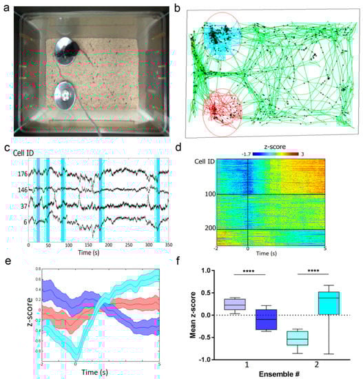In vivo neuronal Ca2+ activity in mouse hippocampus during food intake visualized using FGCaMP7 and an nVista HD miniscope. (a) Photo of the mouse with an nVista HD miniscope mounted on its head during food intake. (b) Mouse trajectory for 1-h imaging session (green) with spikes from all detected neurons (black stars), red and cyan curves—trajectory in the area of cups. Context size: 40 cm by 30 cm. (c) Example normalized ΔF/F0 Ca2+ signals for four individual neurons recorded during the session. Cyan areas show time windows 2 s before entering the cup area and 5 s after. (d) Mean responses of clustered groups of neurons upon cup area-entry transitions (n = 253 neurons from two mice; number of entries, 17 and 24). Zero marks cup area-entry time points. Cells were ordered according to k-means clustering. (e) Average cup area-entry responses of activated (cyan), inhibited (blue) and indifferent (red) ensembles. Lines indicate the average across neurons ± SEM. (f) Average z-score at 2 s time window before entering the cup area and 5 s after for activated (#1) and inhibited (#2) ensembles. p values less than 0.0001 are given four asterisks.