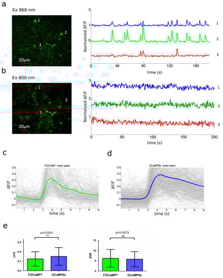 Spontaneous neuronal activity was observed at a depth of 40–250 μm. An example of neuronal activity traces at 960 nm excitation is demonstrated in Figure 8a (right). Though we observed green fluorescence in FGCaMP7-expressing neurons at 800 nm excitation, we could not detect any fluorescence changes associated with Ca2+ dynamics in neurons using this excitation light; perhaps due to the 3.5-fold lower ΔF/F0 response for the 400 nm absorbing form, as compared to the response for the 498 nm absorbing form in vitro (Figure 8b, right; Figure S13; and Table 1). Two-photon excitation of the blue-shifted absorption peak of the NIR-GECO1 indicator also did not result in the observation of fluorescence changes associated with neuronal calcium dynamics in cultured neurons and in vivo [47]. At 960 nm excitation, we observed neuronal activity-dependent changes in fluorescence of the FGCaMP7 anionic form, with a peak ΔF/F0 of 0.37 ± 0.23 (Figure 8c). In the case of GCaMP6s, peak ΔF/F0 was 0.45 ± 0.28 (Figure 8d), which was 1.2-fold higher (p = 0.0001) than that of FGCaMP7 (Figure 8e). Signal-to-noise ratios (SNR) were the same (p = 0.6979) for FGCaMP7 (6.22 ± 4.32) and GCaMP6s (5.82 ± 3.70) (Figure 8e). FGCaMP7 was 1.4–1.5-fold (p < 0.0001) faster, in terms of rise (1.06 ± 0.79 s) and decay (2.07 ± 1.09 s) half-times, when compared with the rise (1.58 ± 0.88 s) and decay (2.88 ± 1.16 s) half-times of GCaMP6s. Hence, the FGCaMP7 indicator could visualize spontaneous neuronal activity in the visual cortex of mouse brain in vivo using two-photon excitation of its anionic form with 960 nm light; in contrast to its second protonated form (excited with 800 nm two-photon light), which was fluorescent but did not respond to neuronal activity.