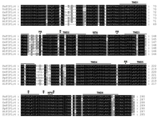 Alignment of PIP1;4 proteins showing six transmembrane domains (TMD1–TMD6), two intracellular and extracellular loops containing the conserved “NPA” motif, the four amino acids corresponding to the ar/R filter (R), and three conserved amino acid residues important for post-translational regulatory processes (PR).