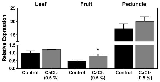Steady-state gene expression of PaPIP1;4 in sweet cherry leaves, fruits, and peduncles treated with 0.5% CaCl2 or water (control). Values are the mean ± SD and asterisks indicate statistical significance (* p ≤ 0.05).