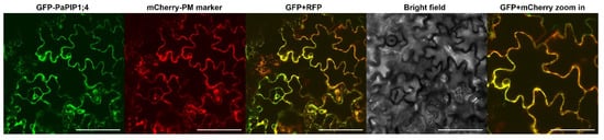 The sub-cellular localization of PaPIP1;4 was studied by the transient expression of the fusion GFP-PaPIP1;4 in Nicotiana benthamiana epidermal cells. The fusion AtPIP2.1-RFP was used as a plasma membrane marker []. Results showed that PaPIP1;4 co-localized with AtPIP2;1, indicating that PaPIP1;4 accumulates at the plasma membrane (Figure 3).